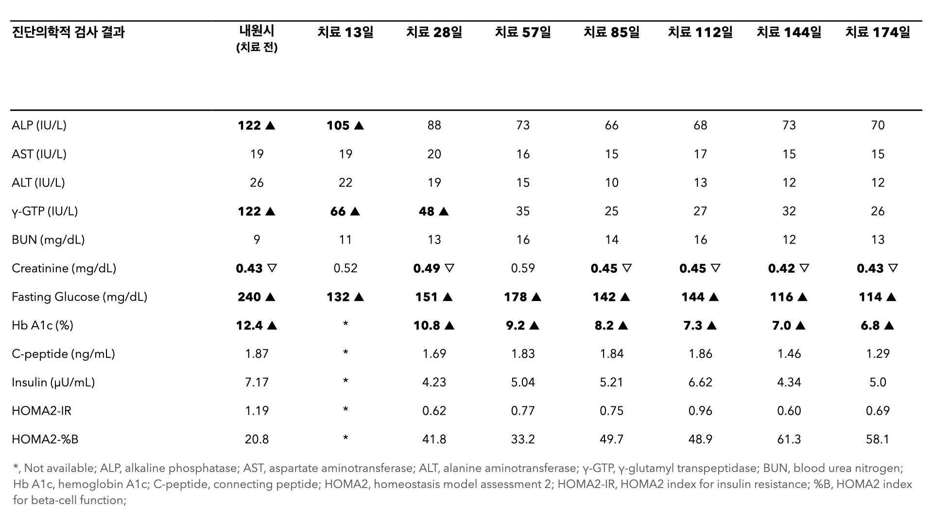 - 당화혈색소(HbA1c): 174일 후 12.4%에서 6.8%로 크게 회복.