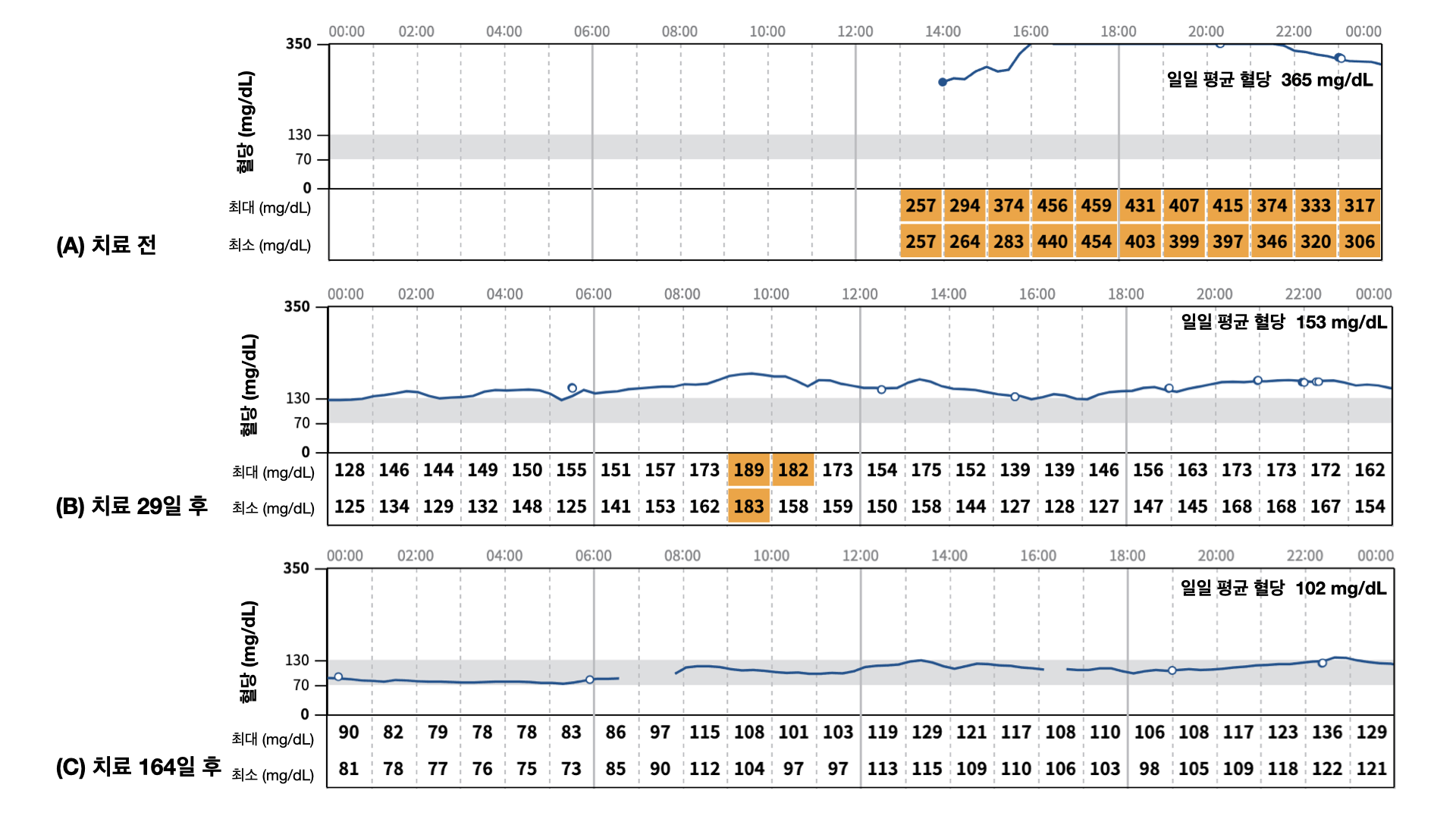 - 평균 혈당(CGM): 300mg/dL 이상에서 102mg/dL로 안정화.
